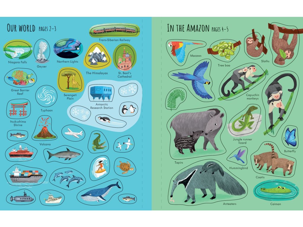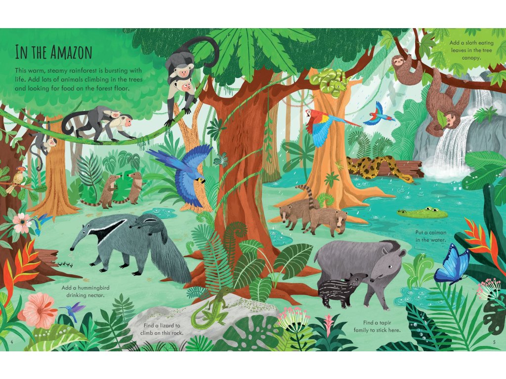 Discover the amazing animals and plants that live in gardens, forests, jungles, oceans and wild places in this colourful sticker book. There are over 180 stickers of animals, plants and bugs to add to the scenes, from caribou in the Arctic to clownfish in a coral reef. Ideal for learning about the natural world and for developing manual dexterity.