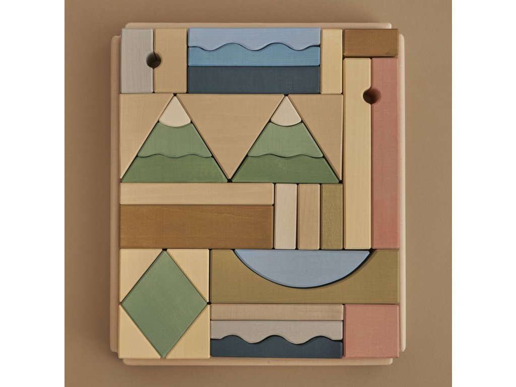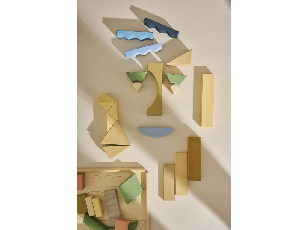 Stavebnice složená z 25 dílků, která kombinuje různé geometrické tvary a přírodní a barevné dřevo.