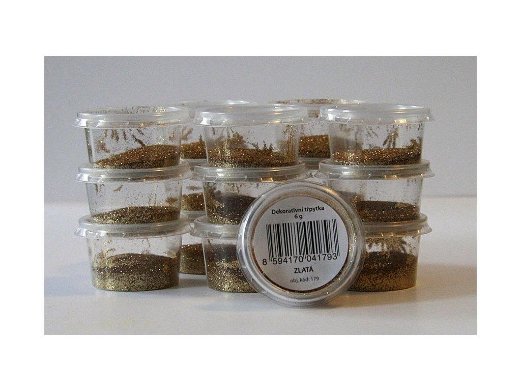 Zlatá – 6 g v plastovém kelímku. Glitr, který se používá na zdobení vánočních baňek, svíček a nehtů.