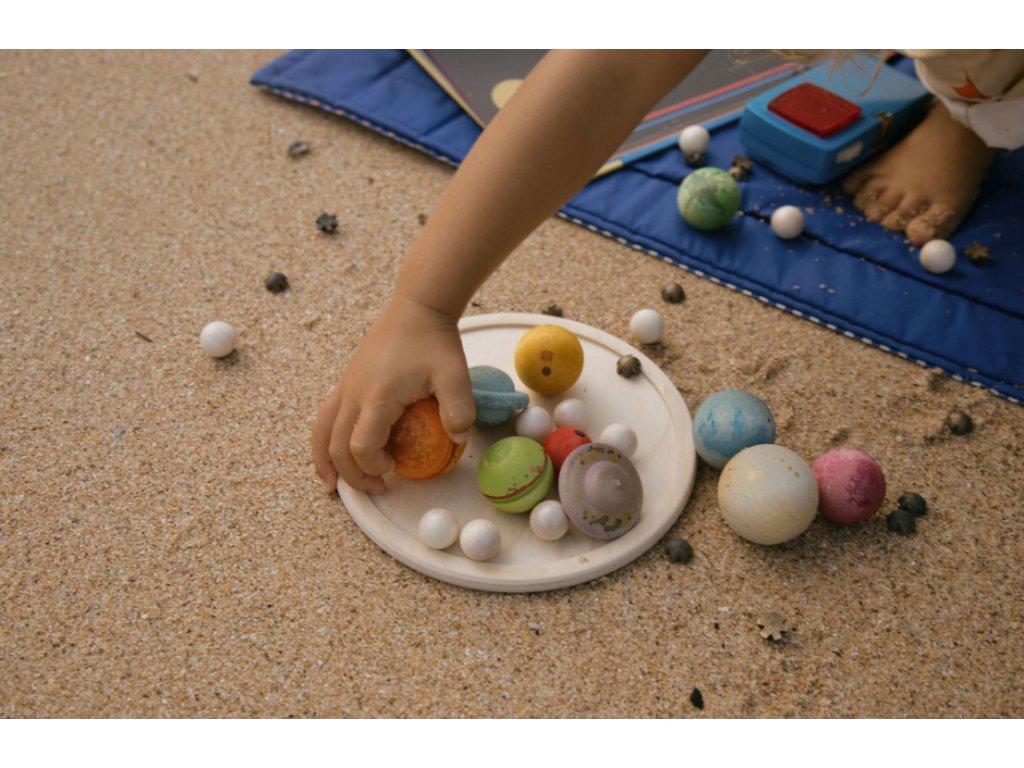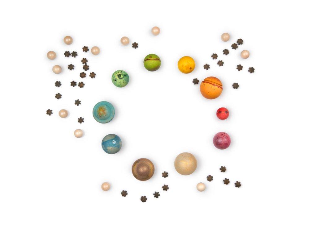 Drahý vesmír obsahuje více než 40 dřevěných figurek v různých velikostech (od 12 mmø do 45 mmø) a barvách.