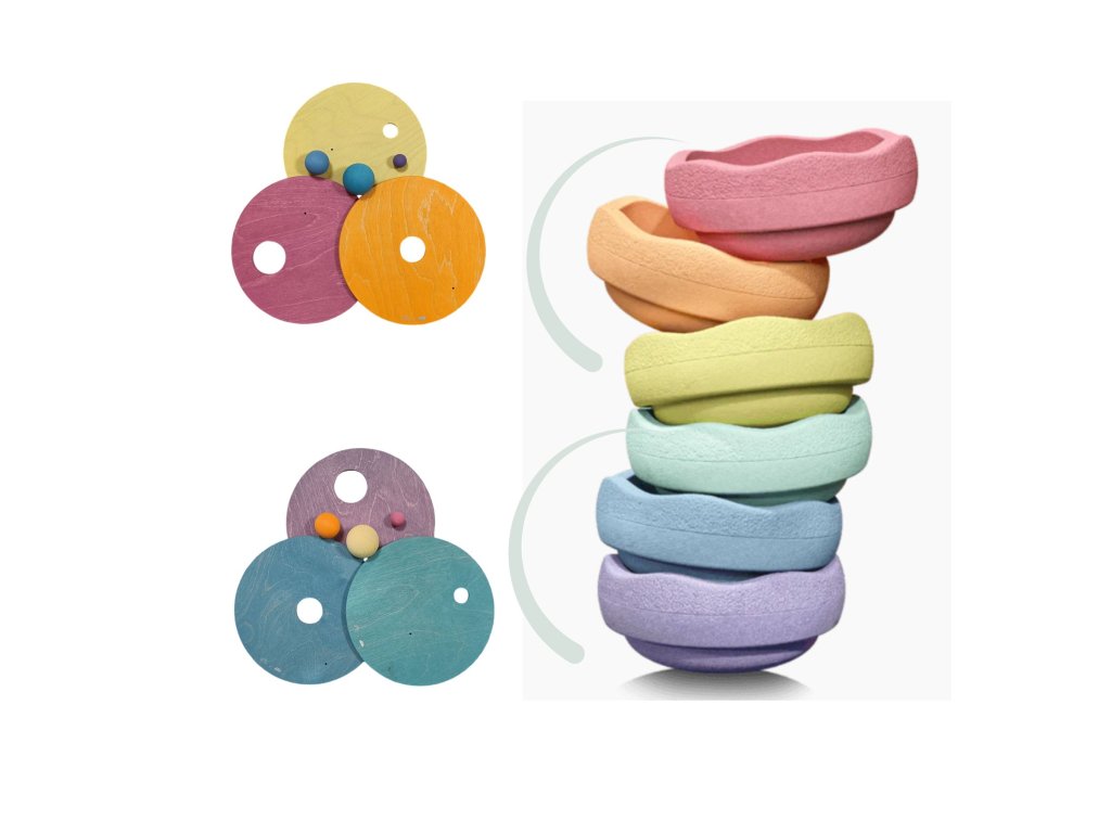 Sada "Rolling Discs" obsahuje tři disky ve třech různých barvách se třemi různě velkými otvory. Sada také obsahuje tři dřevěné koule ve třech různých velikostech a barvách.