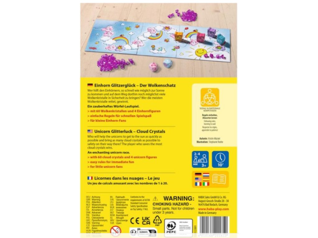 Zrazu prichádza búrka! Jednorožce rýchlo utekajú pred tmavými mrakmi smerom k slnku. Cestou tam chcú pred búrkou doniesť do bezpečia čo najviac oblačných kryštálov. Ktoré dieťa môže pomôcť svojmu jednorožcovi? Jednoduché pravidlá sú rýchlo prečítané a hra s kockou sa môže začať. Kto sa so svojou figúrkou jednorožca dostane k slnečnému mraku ako prvý a nazbiera najviac kryštálov oblakov, môže vyhrať túto s láskou navrhnutú hru.