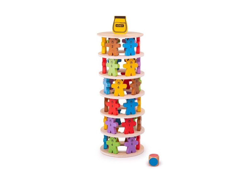 Postavte za pomoci medvídků věž. Hoďte si kostkou, která určí barvu medvěda, na první dřevěný kruh postavte 6 medvědů a poté na ně položte další dřevěný kruh. Tento postup opakujte. Ale pozor, ať vám medvědí věž nespadne! Vyrobeno z kvalitních materiálů ze zodpovědných zdrojů. Splňuje evropské bezpečnostní standardy. Vhodné od 3 let.