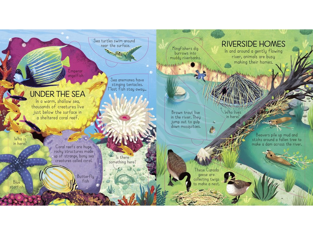 Zvedněte chlopně a podívejte se, jak si zvířata staví domy v extrémních teplotách, jak se ukrývají v teplém korálovém útesu nebo na břehu řeky a mnoho dalšího. Kniha nabízí více než 80 chlopní k zvedání a odkazy na webové stránky s videi a obrázky skutečných zvířecích obydlí.