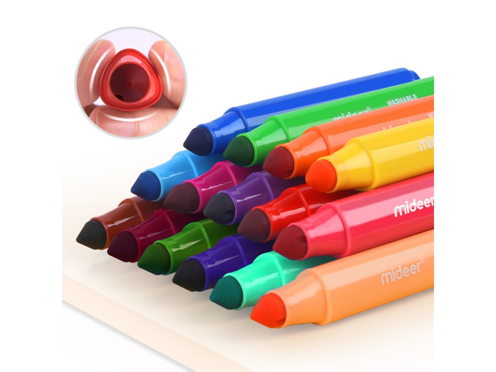 Mají trojúhelníkový tvar pro snadné držení v dětské ruce.