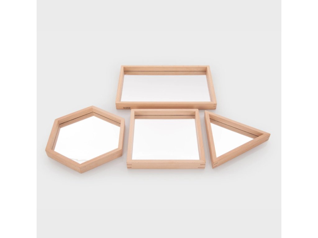 Sada obsahuje: 4 podnosy s dřevěným rámem a akrylovou zrcadlovou základnou.