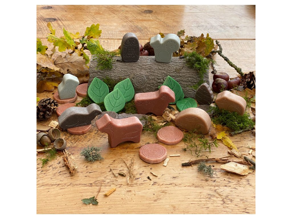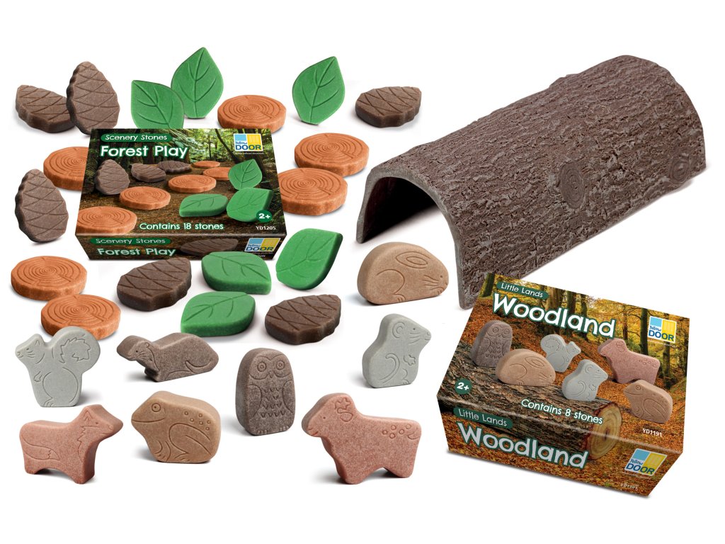 Set obsahuje: 8 figurek lesních zvířátek, 18 kulisových kamenů a 1 duté poleno